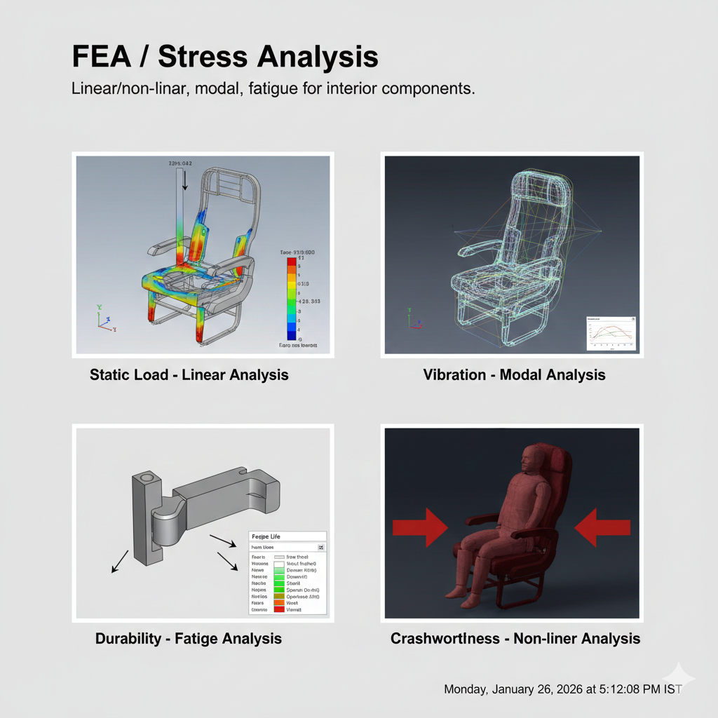 linear/non-linear, modal, fatigue for interior components.