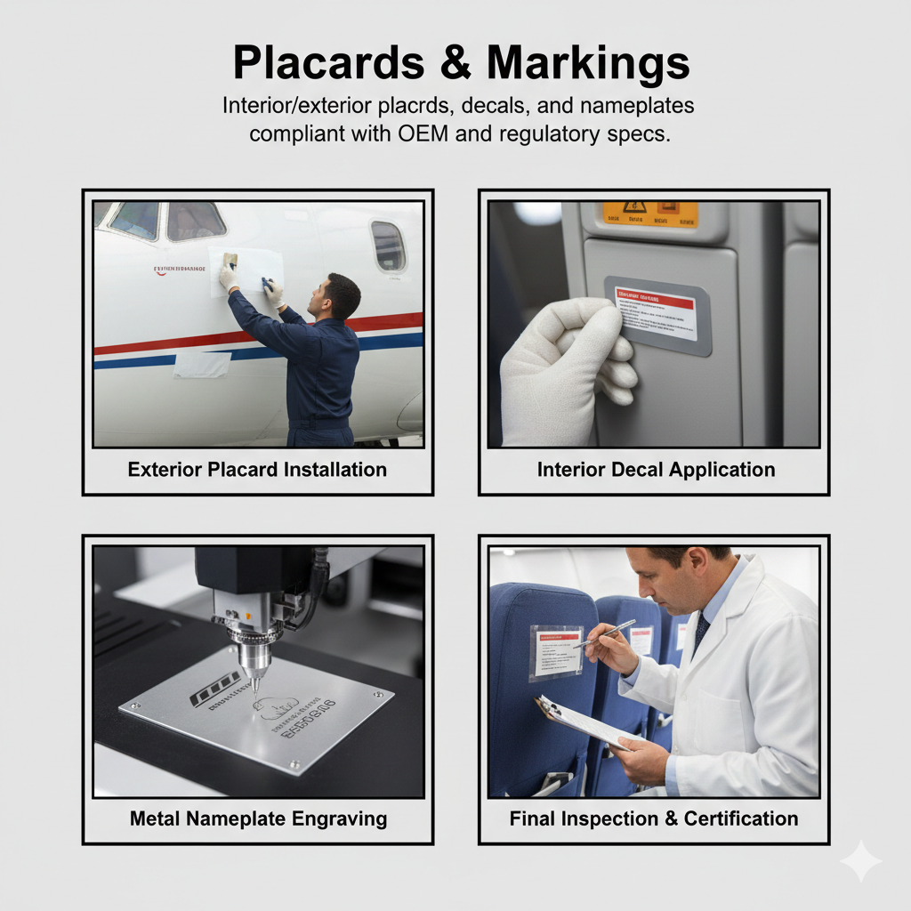 Interior/exterior placards, decals, and nameplates compliant with OEM and regulatory specs.