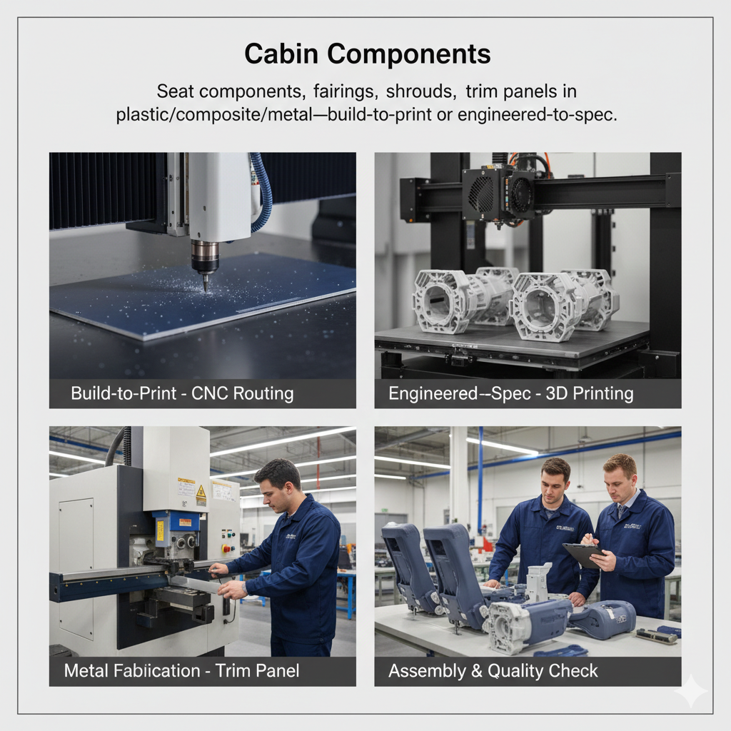 Seat components, fairings, shrouds, trim panels in plastic/composite/metal—build-to-print or engineered-to-spec.
