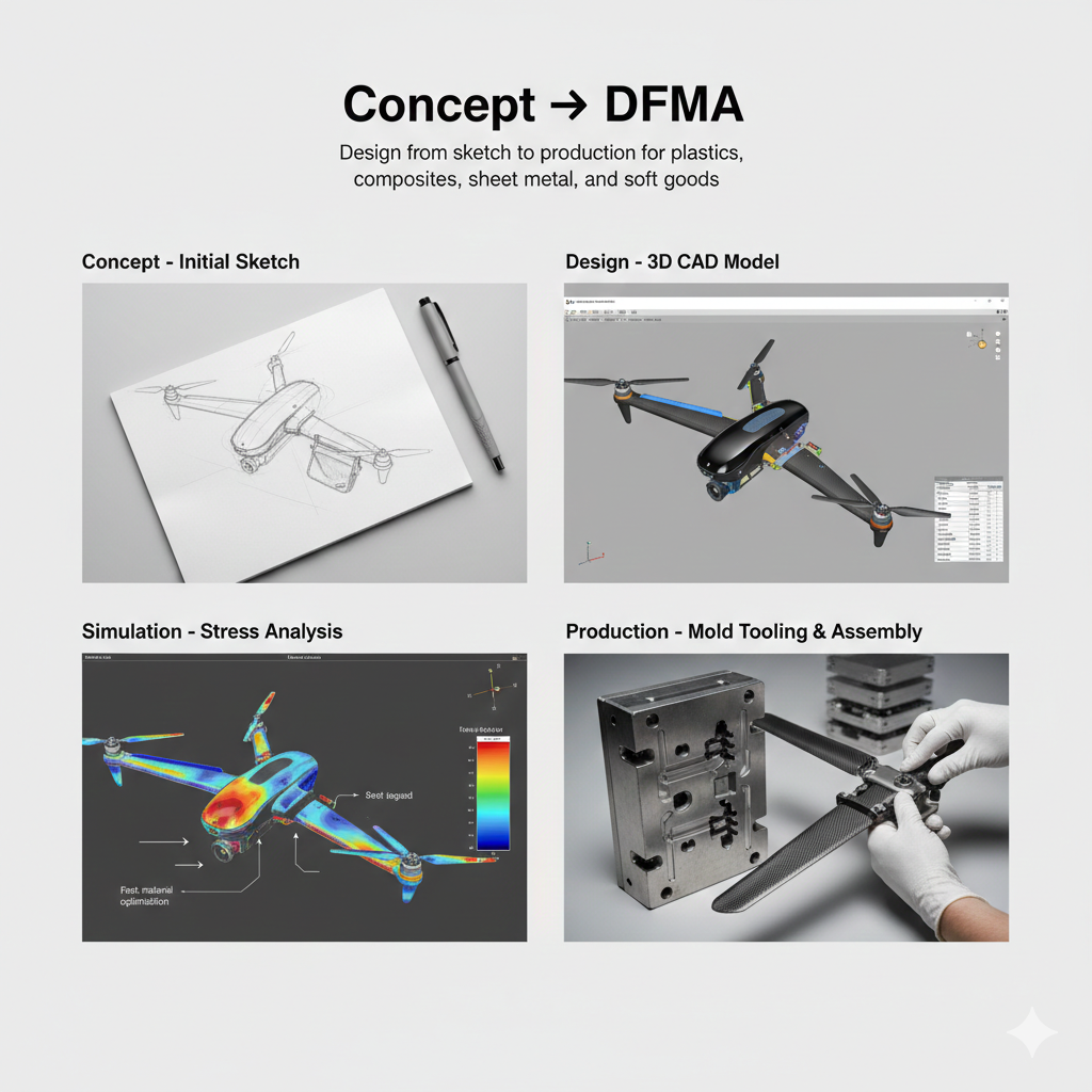 Design from sketch to production for plastics, composites, sheet metal, and soft goods.