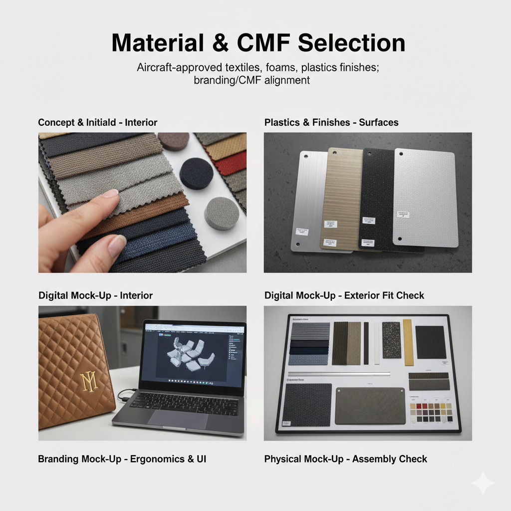 Aircraft-approved textiles, foams, plastics, finishes; branding/CMF alignment.