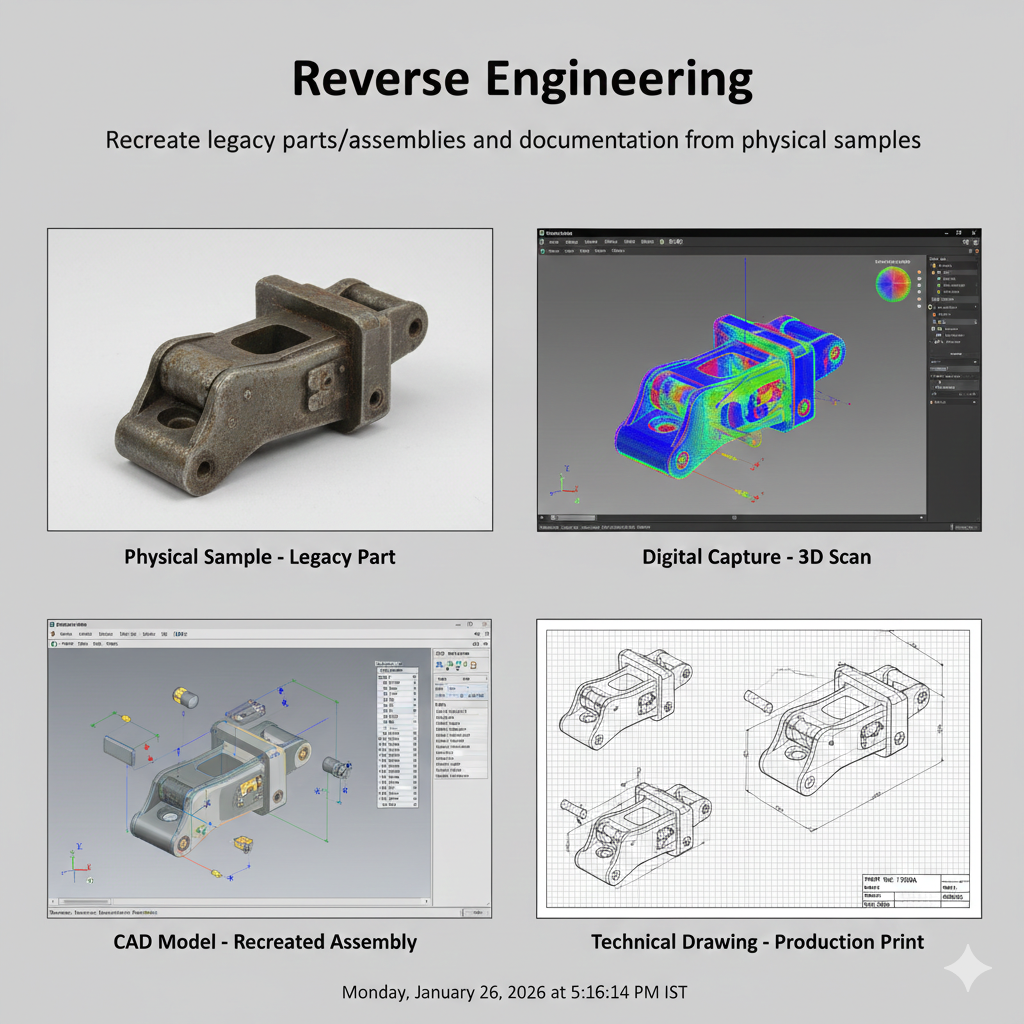 Recreate legacy parts/assemblies and documentation from physical samples.