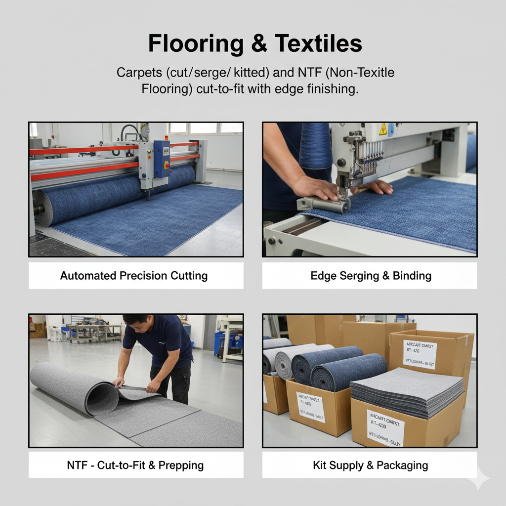 Carpets (cut/serge/kitted) and NTF (Non-Textile Flooring) cut-to-fit with edge finishing.