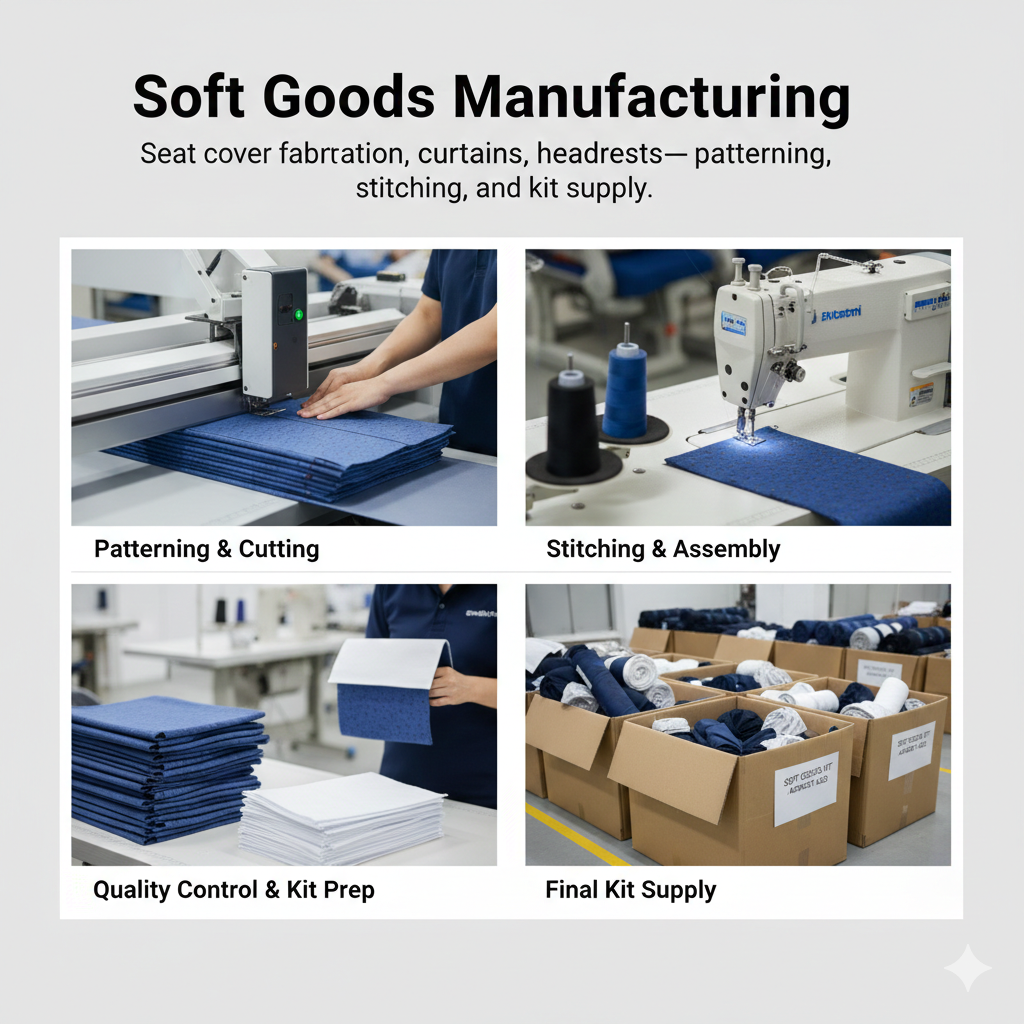 Seat cover fabrication, curtains, headrests—patterning, stitching, and kit supply.
